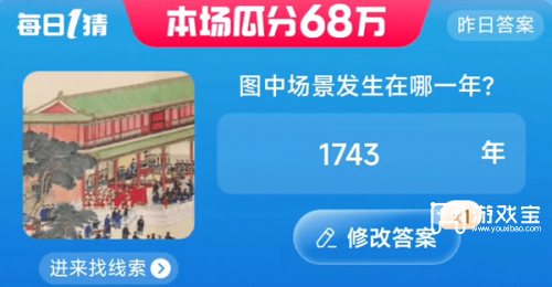 熊二透视自瞄辅助1、图中场景发生在哪一年?2、答:1743。3、将没有叉号的告示牌连接起来就能得到数字1743。